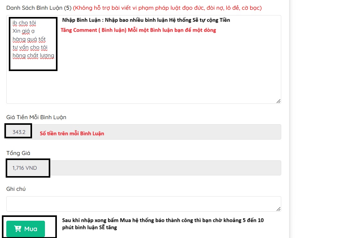 Bước 2: Trong ô như hình dưới nhập Bình luận và xem giá tiền, nếu đồng ý mua thì bạn bấm mua, hệ thống báo thành công thì bạn đã hoàn thành ( Lưu ý mỗi bình luận 1 dòng )